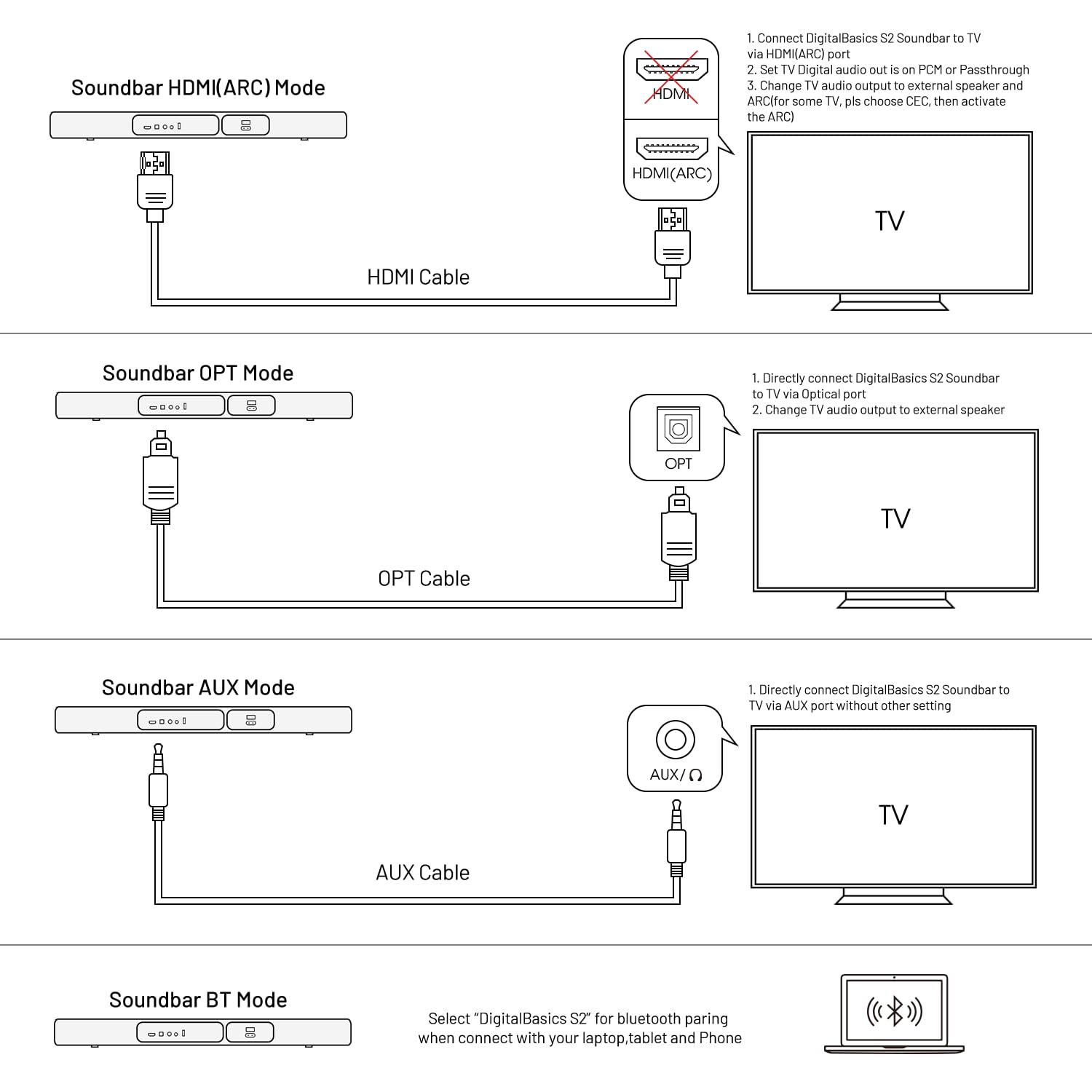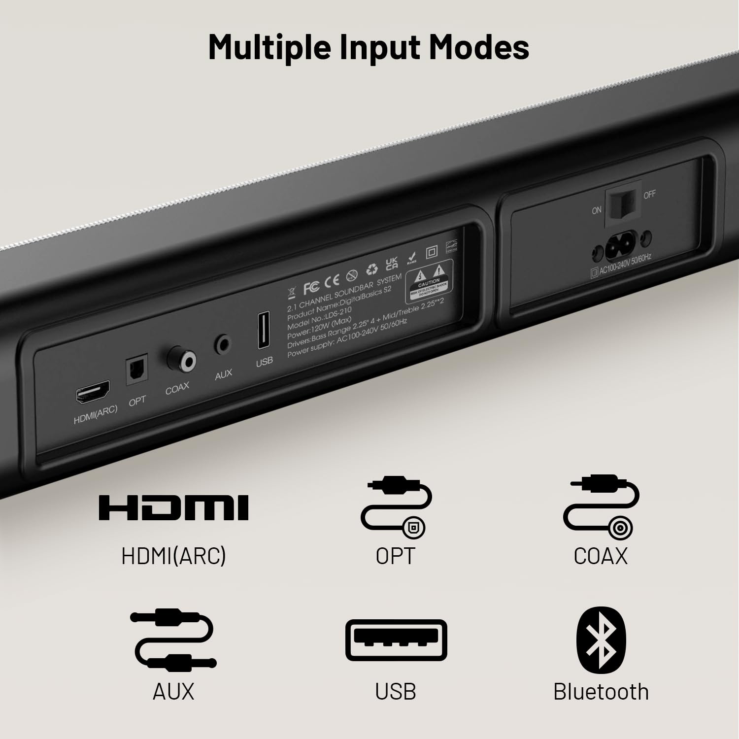 Plug-and-Play Connectivity – HDMI ARC, Bluetooth 5.0, optical, AUX, and Coaxial for universal compatibility.